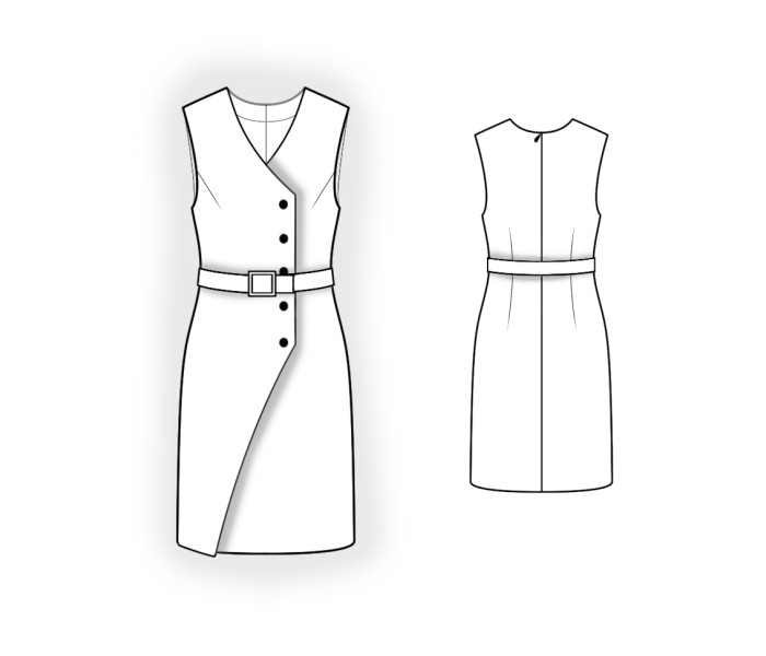 Introducing a digital pattern for a sleeveless belted dress with an asymmetric front and decorative buckle – Modern Sophistication with a Minimal Twist.