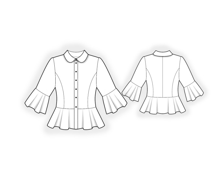 Introducing a digital sewing pattern for the feminine blouse with flared sleeve ruffles and a softly flared peplum – Romantic Charm with Tailored Elegance.