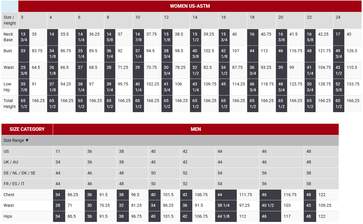 | Bust | 33 | 83.75 | 34 1/8 | 86.75 | 35 1/4 | 89.5 | 36 1/4 | 92 | 37 1/4 | 94.5 | 38 3/4 | 98.5 | 40 3/8 | 102.5 | 42 1/8 | 107 | 44 | 112 | 46 | 116.75 | 48 | 121.75 | 49 3/4 | 126.5 |